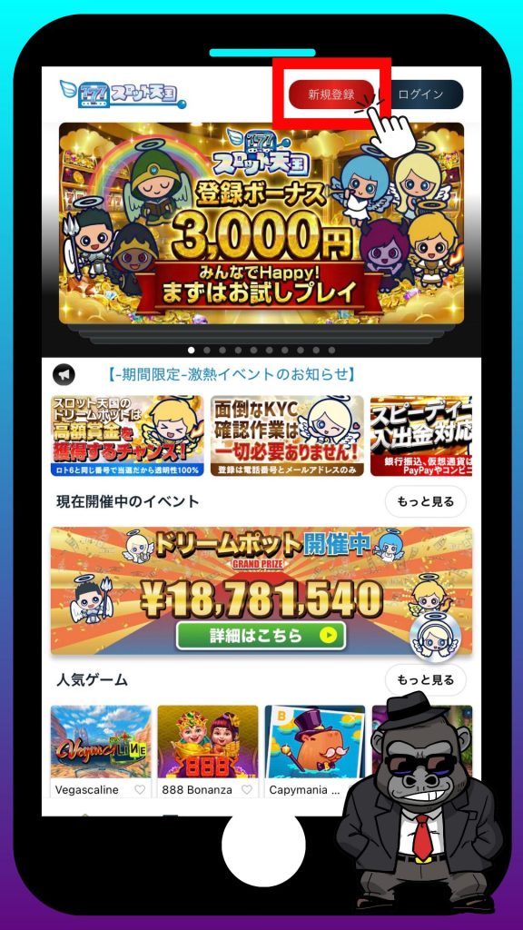 スロット天国は、KYC不要で簡単に登録できるオンラインカジノで、スロット・ライブカジノ・パチンコ・パチスロなど、幅広いゲームを楽しめるのが特徴です。